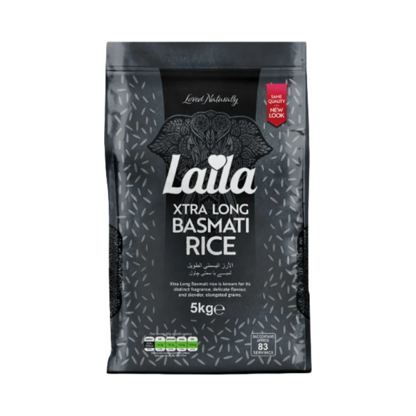 Laila Extra Long Basmati Rice 5kg is premium quality basmati rice known for its extra-long grains, delicate aroma, and fluffy texture after cooking. It is carefully aged to enhance flavor and is ideal for preparing biryani, pilaf, fried rice, and everyday rice meals.