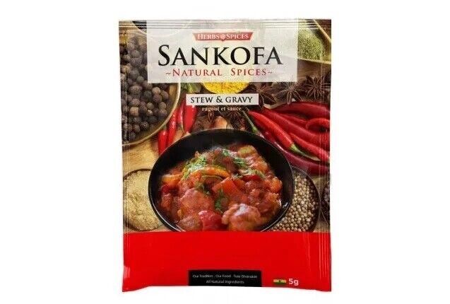Sankofa Natural Spice Stew and Gravy 10g is a seasoning blend designed to improve the flavor of tomato stews, gravies, and sauce-based dishes.